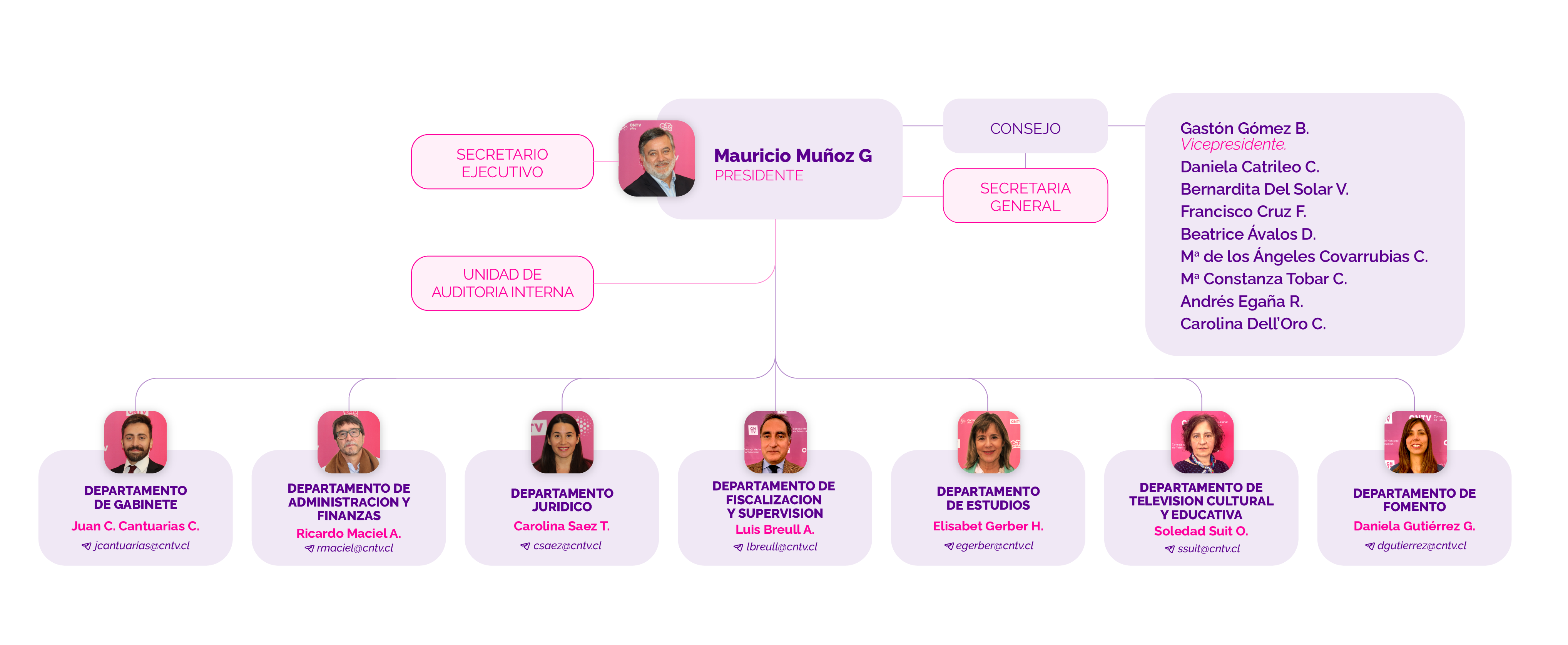 El Consejo Nacional de Televisión es un órgano constitucional autónomo con personalidad jurídica y patrimonio propio, y se relaciona con el Presidente de la República por intermedio del Ministerio Secretaría General de Gobierno.